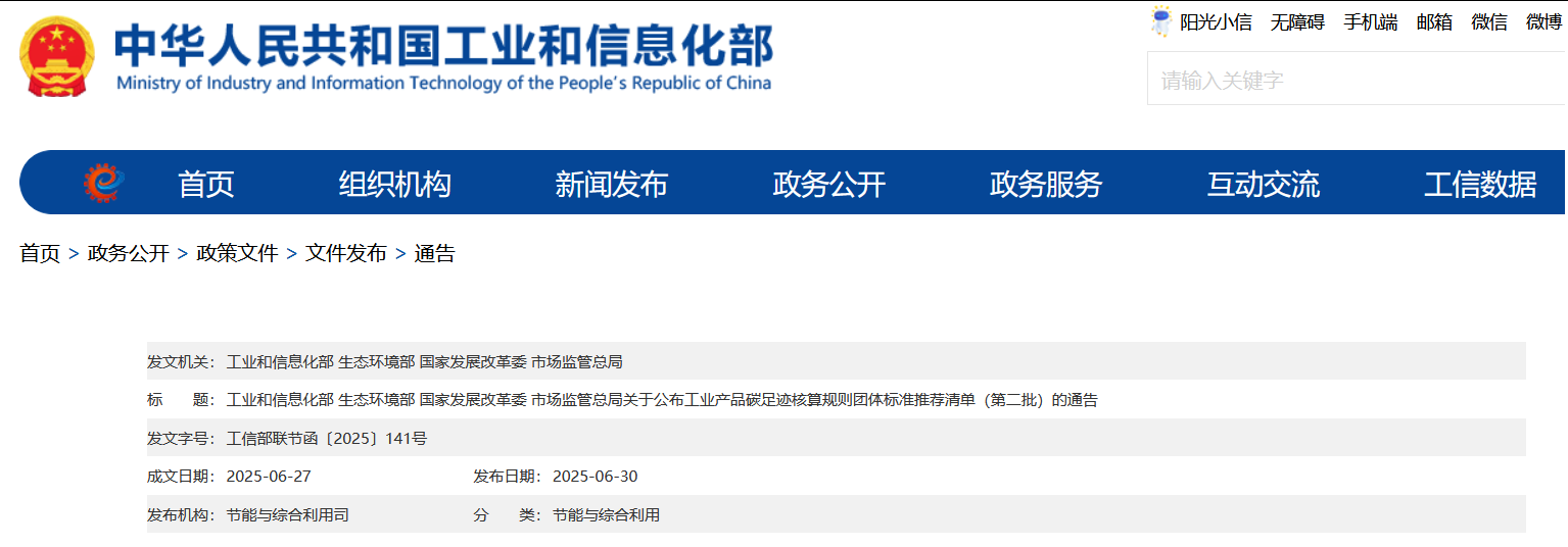 工業(yè)和信息化部等四部門關于公布工業(yè)產(chǎn)品碳足跡核算規(guī)則團體標準推薦清單(第二批)的通告